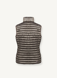 Ženski brezrokavnik iz recikliranega materiala z mavričnim učinkom in vodoodporno obdelavo. Podložen je s naravnim perjem. Rahlo oprijet na pasu, kar doda ženstven dotik temu športnemu modelu.
