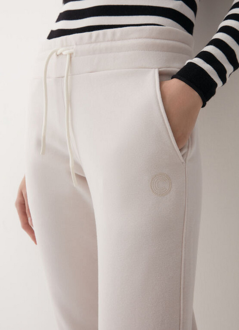 Ženske hlače iz blaga žametnega videza in brušene znotraj. Model običajnega kroja z vrvico, ki pomaga prilagoditi obseg pasu, in ženstvenim bleščečim potiskom logotipa Colmar, ki osvetli ta kombinezon, zaradi česar je trendovski.