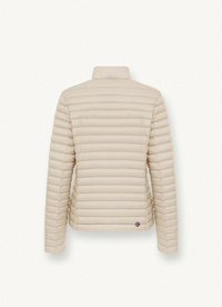 Ženska jakna izdelana iz recikliranega ultralahkega materiala z vodoodporno obdelavo. Napolnjena s svetlim naravnim puhom. Ikonična jakna s 100 grami, ki prihaja v novih pomladnih odtenkih, je izrazito ženstvena zaradi ožjega kroja, ki rahlo poudari pas. Športna in glamurozna hkrati.
