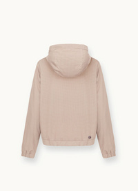 Ženska jakna s pritrjeno kapuco, izdelana iz teksturiranega materiala s seersucker učinkom, ki ima vichy vzorec, ter podlogo iz recikliranega materiala. Ta K-way model dobi nov videz in uporablja intenzivne in svetle barvne kontraste, da dodajo značaj temu oblačilu z čistimi linijami. Minimalističen in prefinjen, je opremljen s praktičnimi stranskimi žepi in nastavljivo vrvico na robu in kapuci. Udobno in praktično oblačilo za eleganten korak v zgodnje pomladne dni.